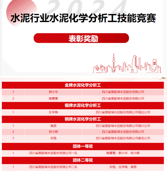 9月24日,由中國水泥協(xié)會發(fā)布關(guān)于《2024年水泥行業(yè)水泥化學(xué)分析工技能競賽》表彰獎勵的決定,對8月22日至26日,在四川綿陽舉行的2024年全國水泥化學(xué)分析工技能競賽中涌現(xiàn)出來的優(yōu)秀選手和單位進(jìn)行表彰。其中,星船城公司共6名參賽選手在總共60名參加決賽的選手中脫穎而出,郭小華以總成績第1名、陶菁菁以第3名的成績,榮獲“金牌水泥化學(xué)分析工”稱號;莊學(xué)梅榮獲“銀牌水泥化學(xué)分析工”稱號;高燕、林小輝、宋艷榮獲“銅牌水泥化學(xué)分析工”稱號。星船城公司一隊(duì)(陶菁菁、郭小華、林小輝)以總成績第一名榮獲團(tuán)體一等獎;星船城公司二隊(duì)(宋艷、莊學(xué)梅、高燕)以總成績第八名榮獲團(tuán)體二等獎;實(shí)現(xiàn)全部參賽選手進(jìn)入決賽、全部獲得個(gè)人競賽獎及團(tuán)體一、二等獎的歷史最佳戰(zhàn)績。